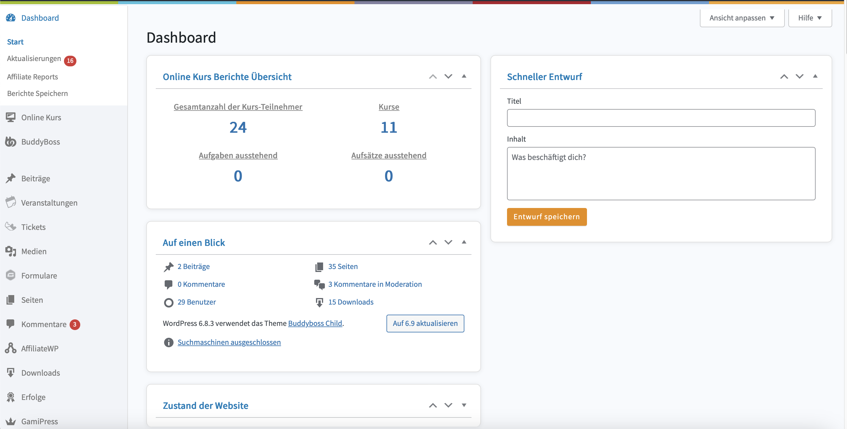 Nach dem Login wirst du automatisch ins Backend zum Dashboard (= Startseite des Backends) weitergeleitet: