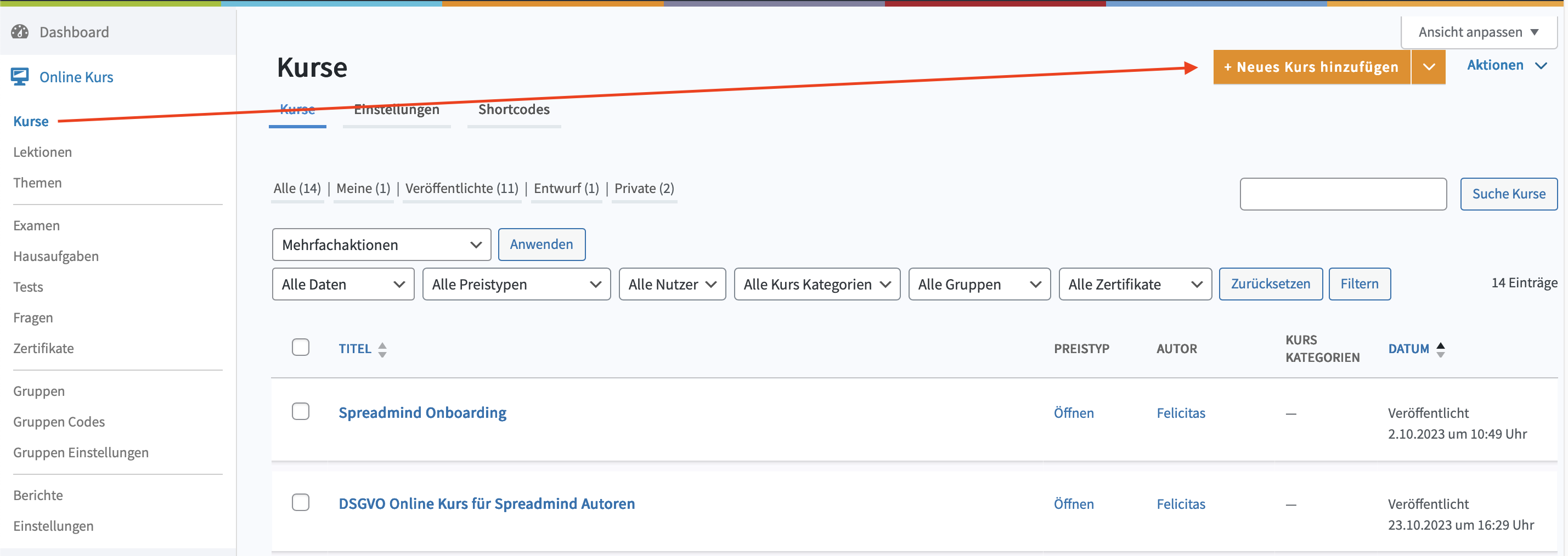 Gehe im Backend deiner Spreadmind Plattform zu der Rubrik "Online Kurs" > "Kurse" und klicke oben auf den Button Hinzufügen, um einen neuen Online Kurs zu erstellen: