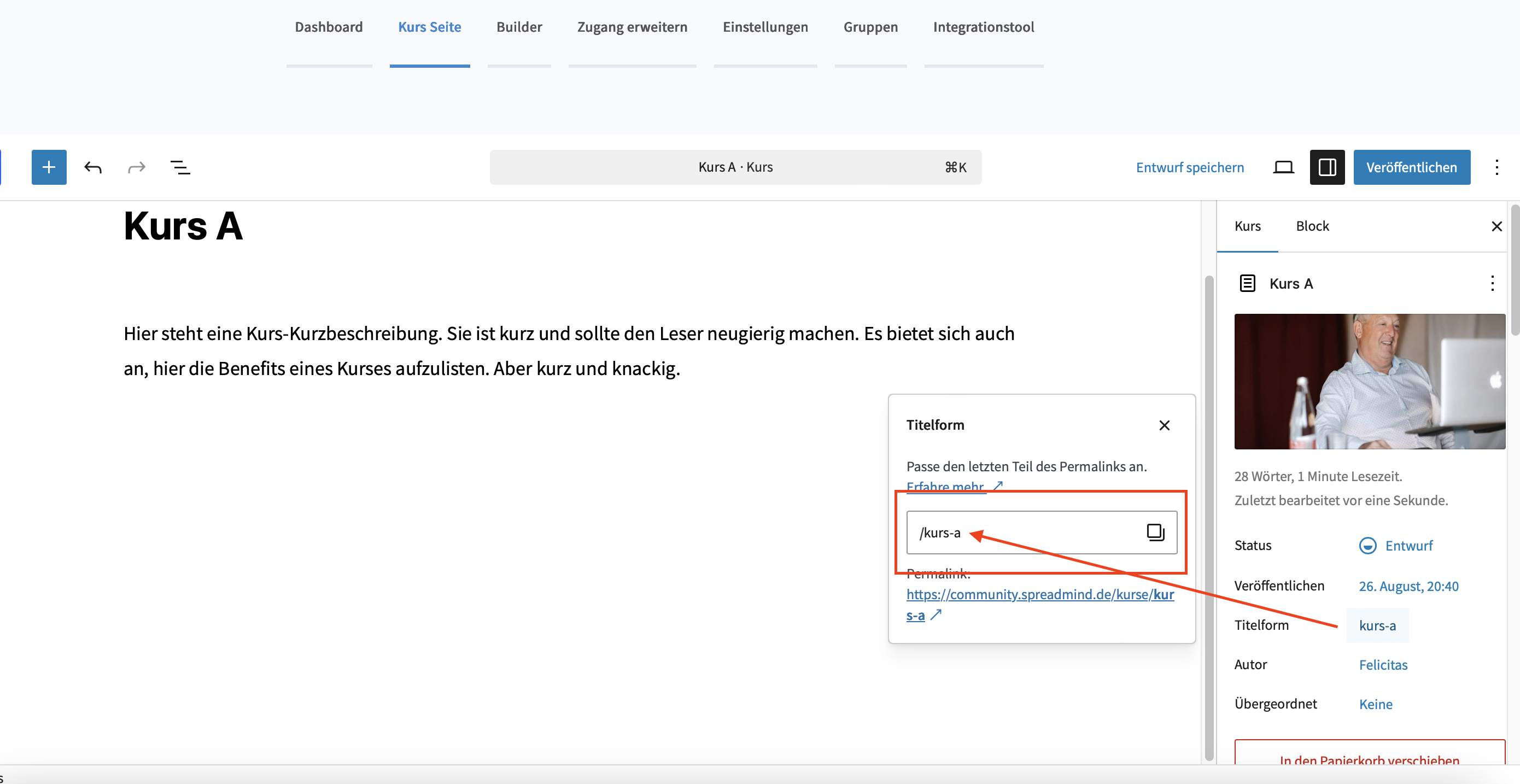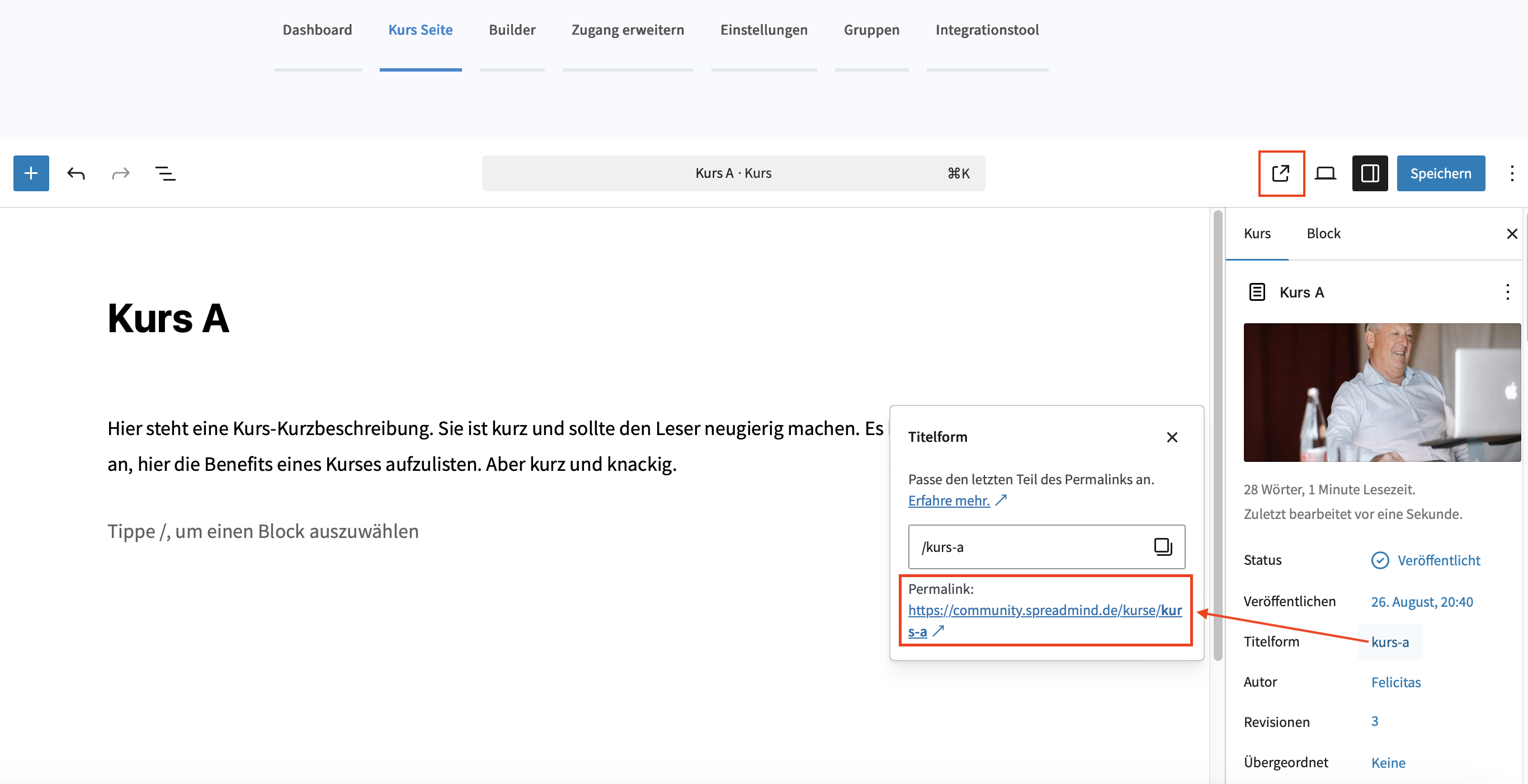 Den Permalink (direkte URL zu deinem Online Kurs) kannst du jederzeit anpassen, in dem du ihn in der Sidebar manuell anpasst: