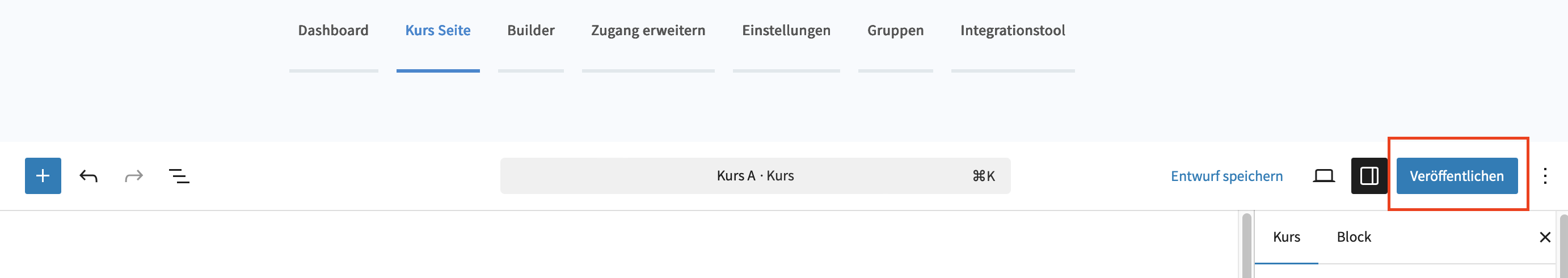 Alle Anpassungen werden als Entwurf zwischengespeichert. Mithilfe des Buttons "Veröffentlichen" wird der Kurs dann auch im Frontend veröffentlicht. Nach dem Veröffentlichen ändert sich der Button automatisch zu "Speichern".