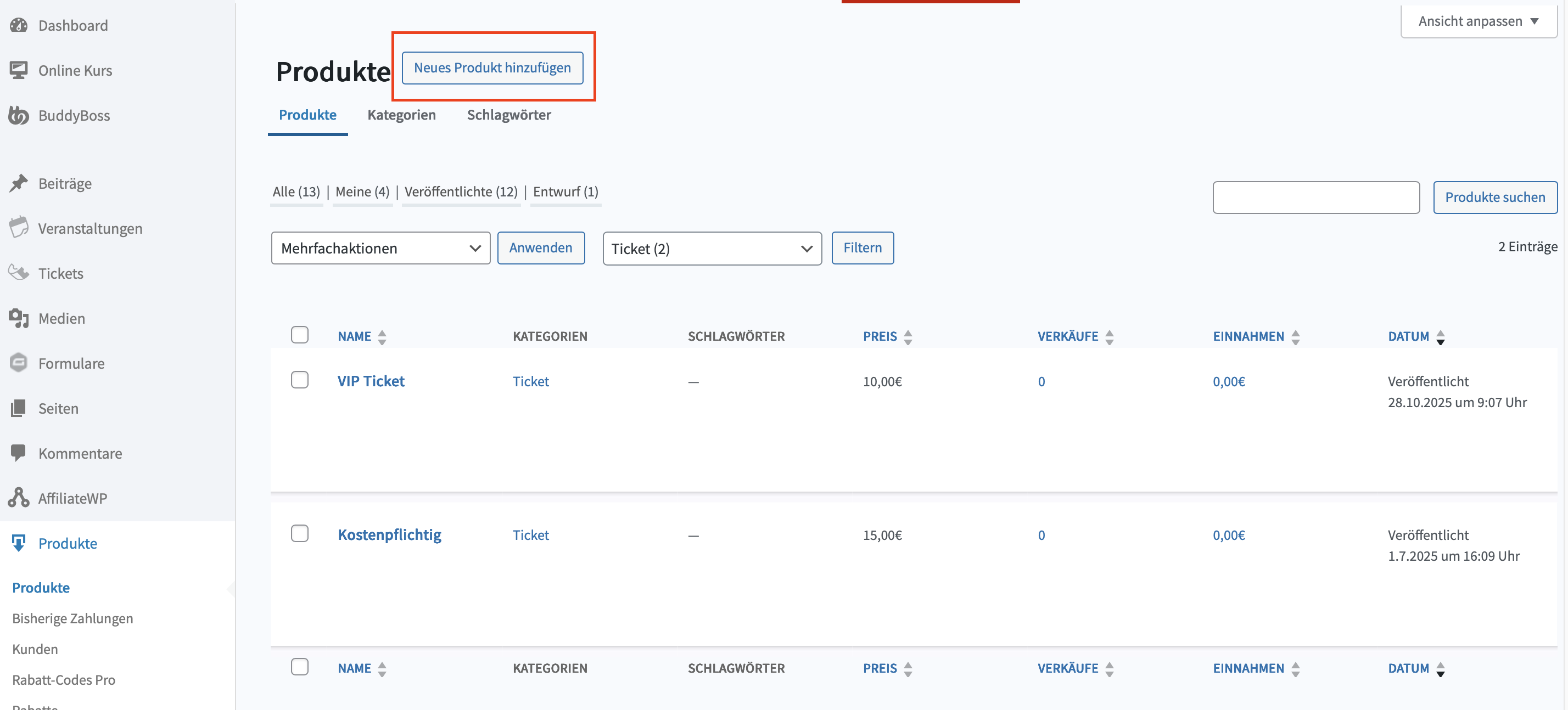 Im Backend unter “Produkte” > “Produkte” kann ein neues Produkt hinzugefügt werden: