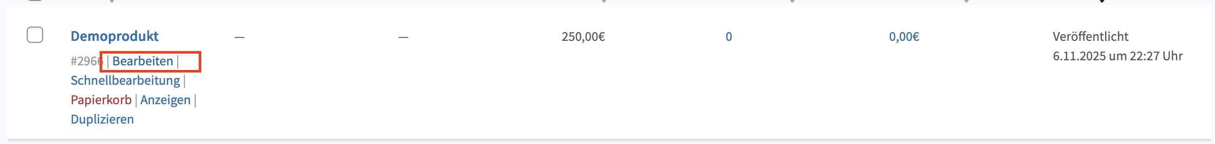 Wurde bereits ein Produkt erstellt, kann dieses unter “Produkte” > “Produkte” bearbeitet werden. Dazu wird der Button "Bearbeiten" geklickt, der sichtbar wird bei Mouseover: