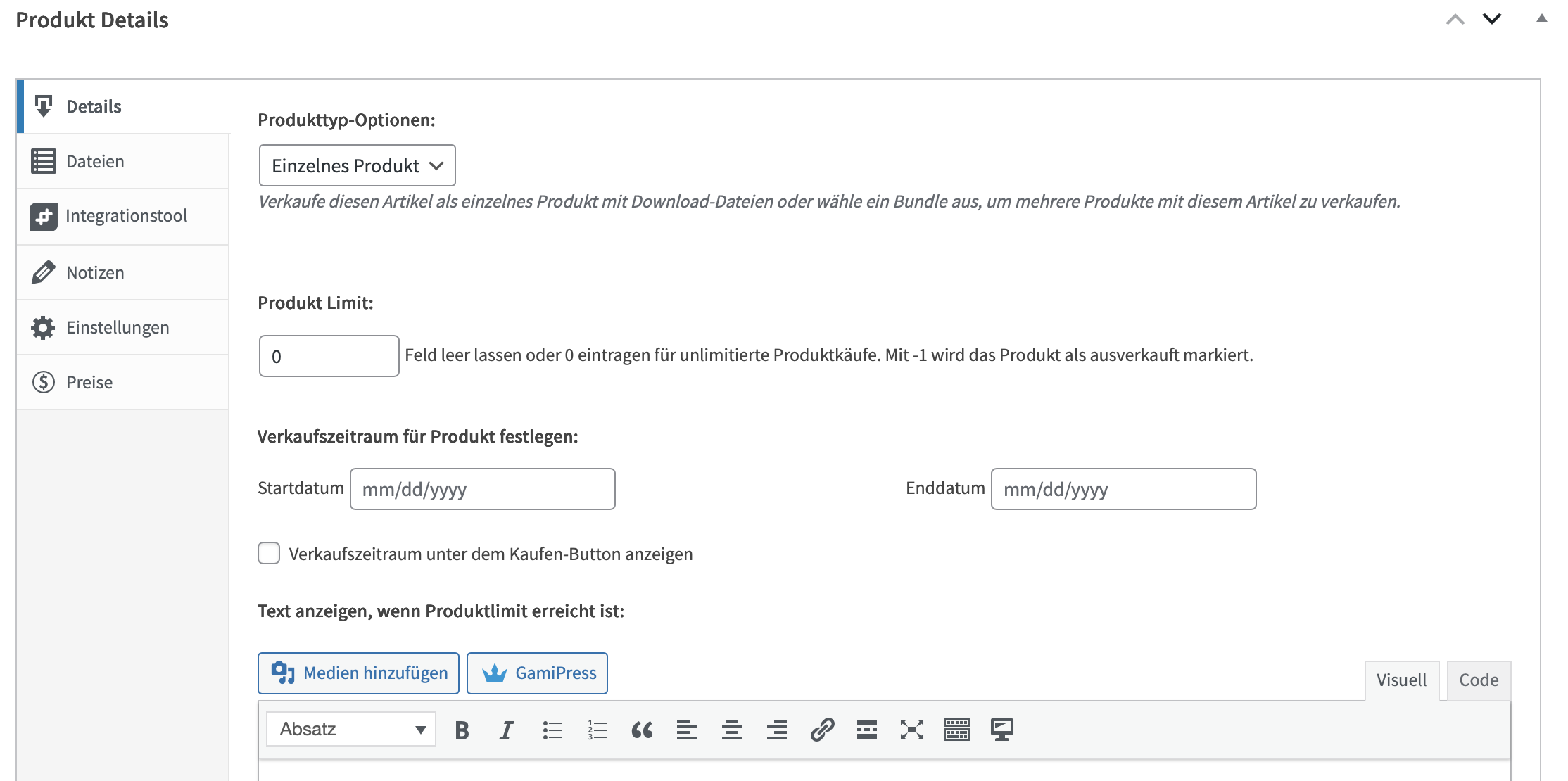 In den Produktdetails können Produkttyp, Produktlimit und ein Verkaufszeitraum eingestellt werden.