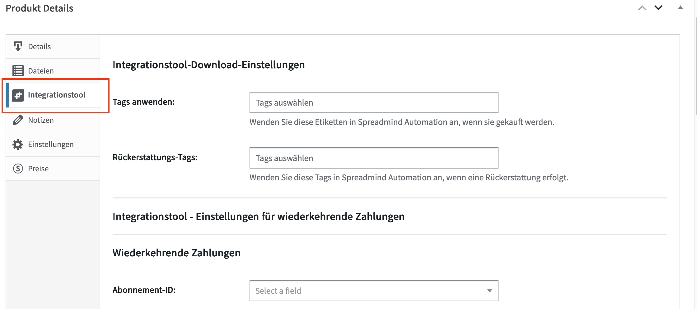 In den Einstellungen zum Integrationstool können Tags für verschiedene vorgegebene Szenarien im Zusammenhang mit einem Produktkauf hinterlegt werden.