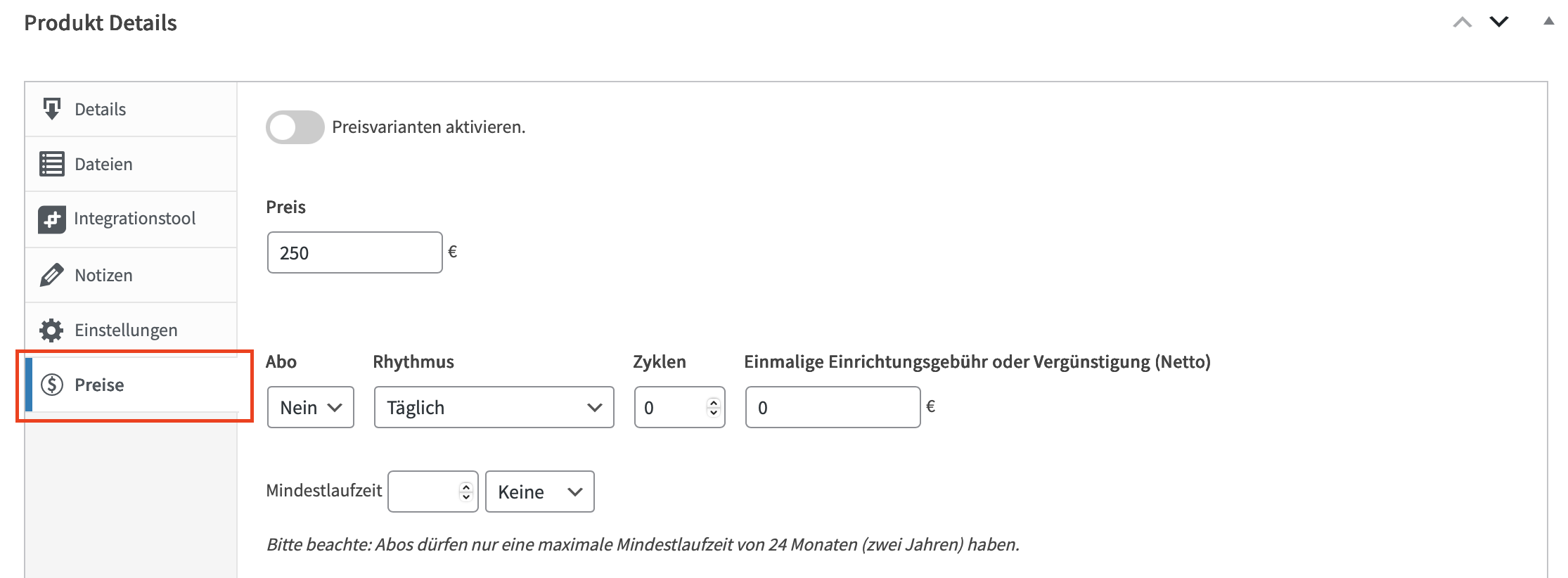 In diesem Bereich können Preise, Preisvarianten, eine kostenlose Testphase oder ein Abonnement hinterlegt werden.